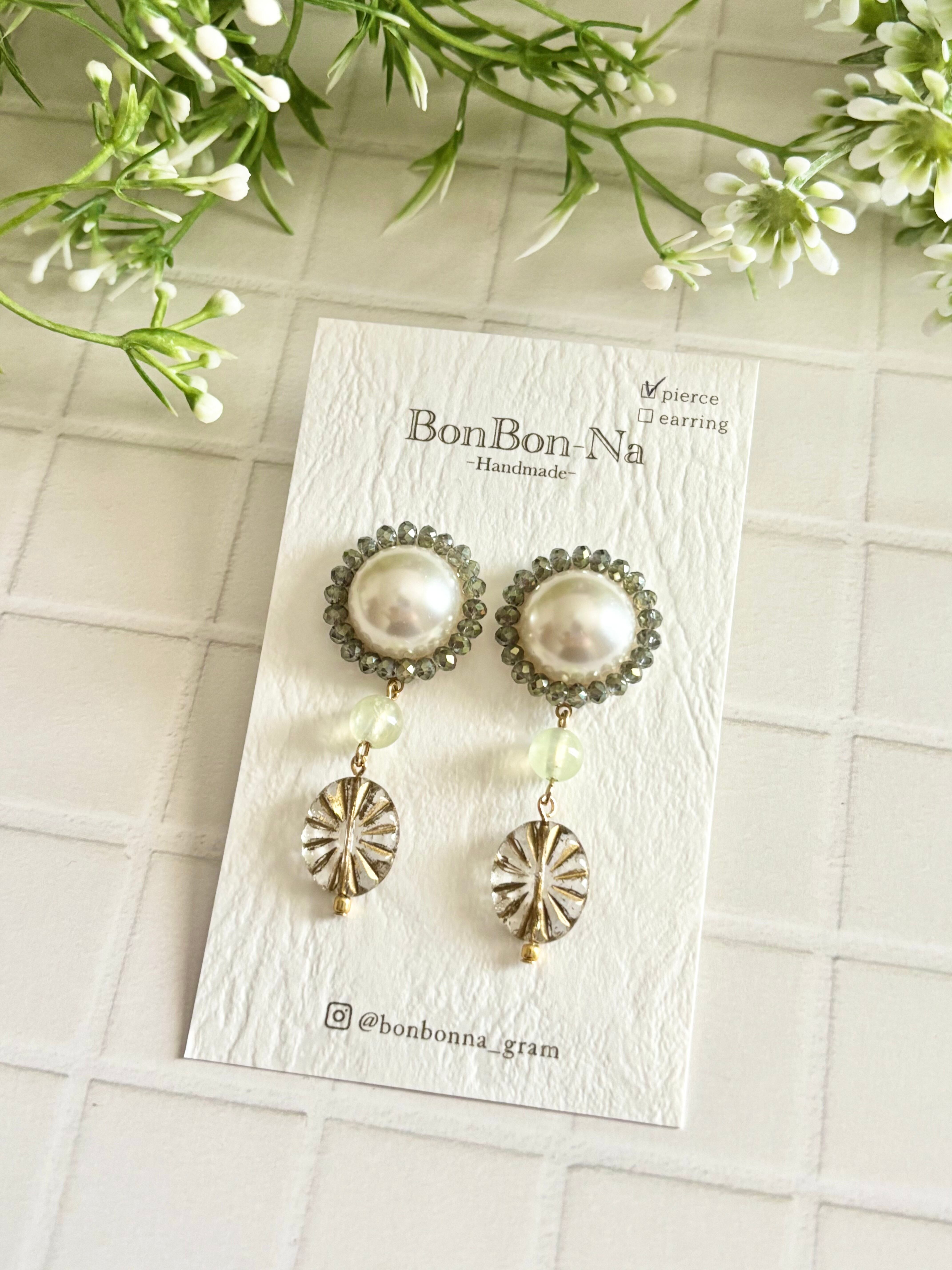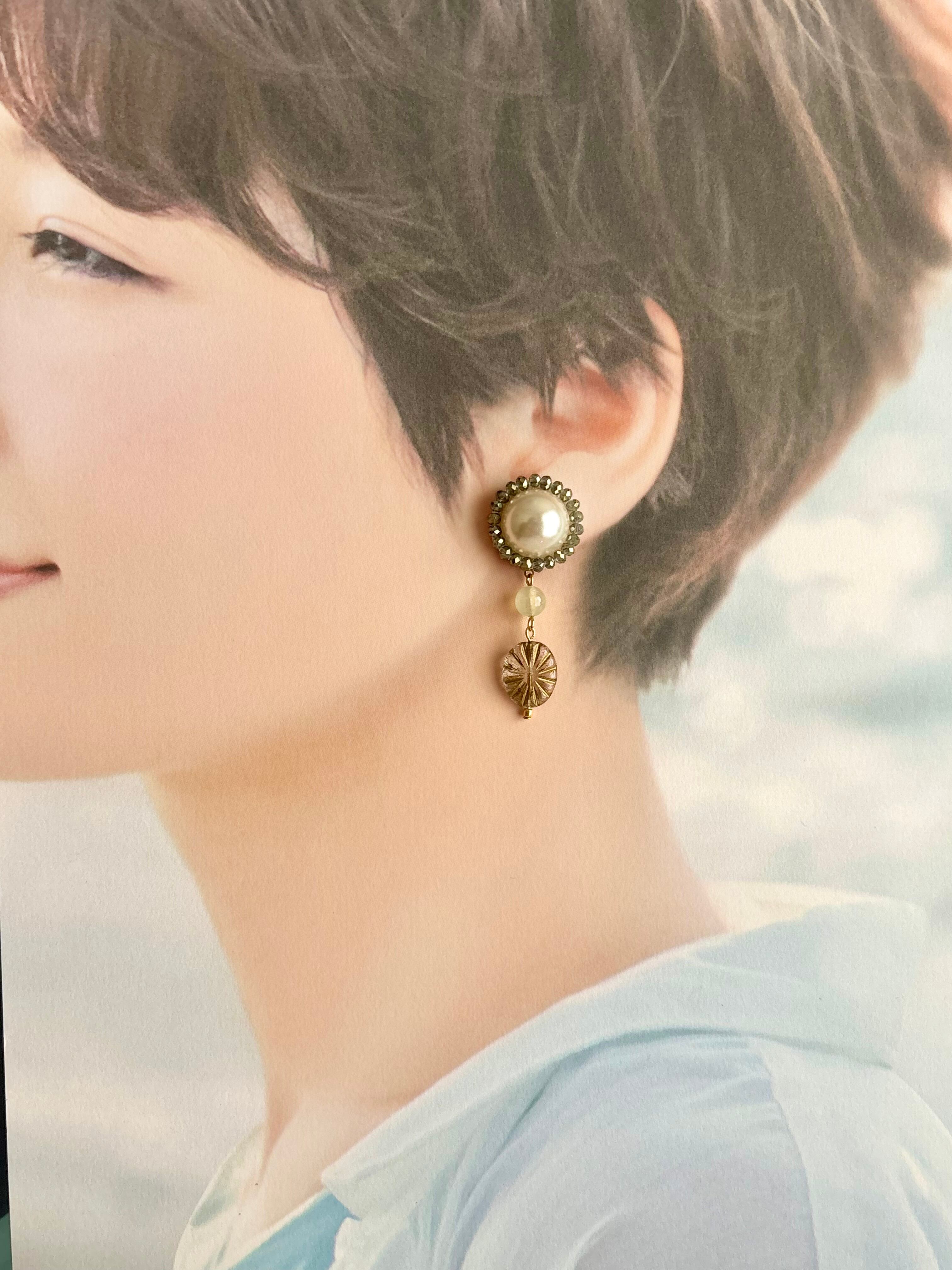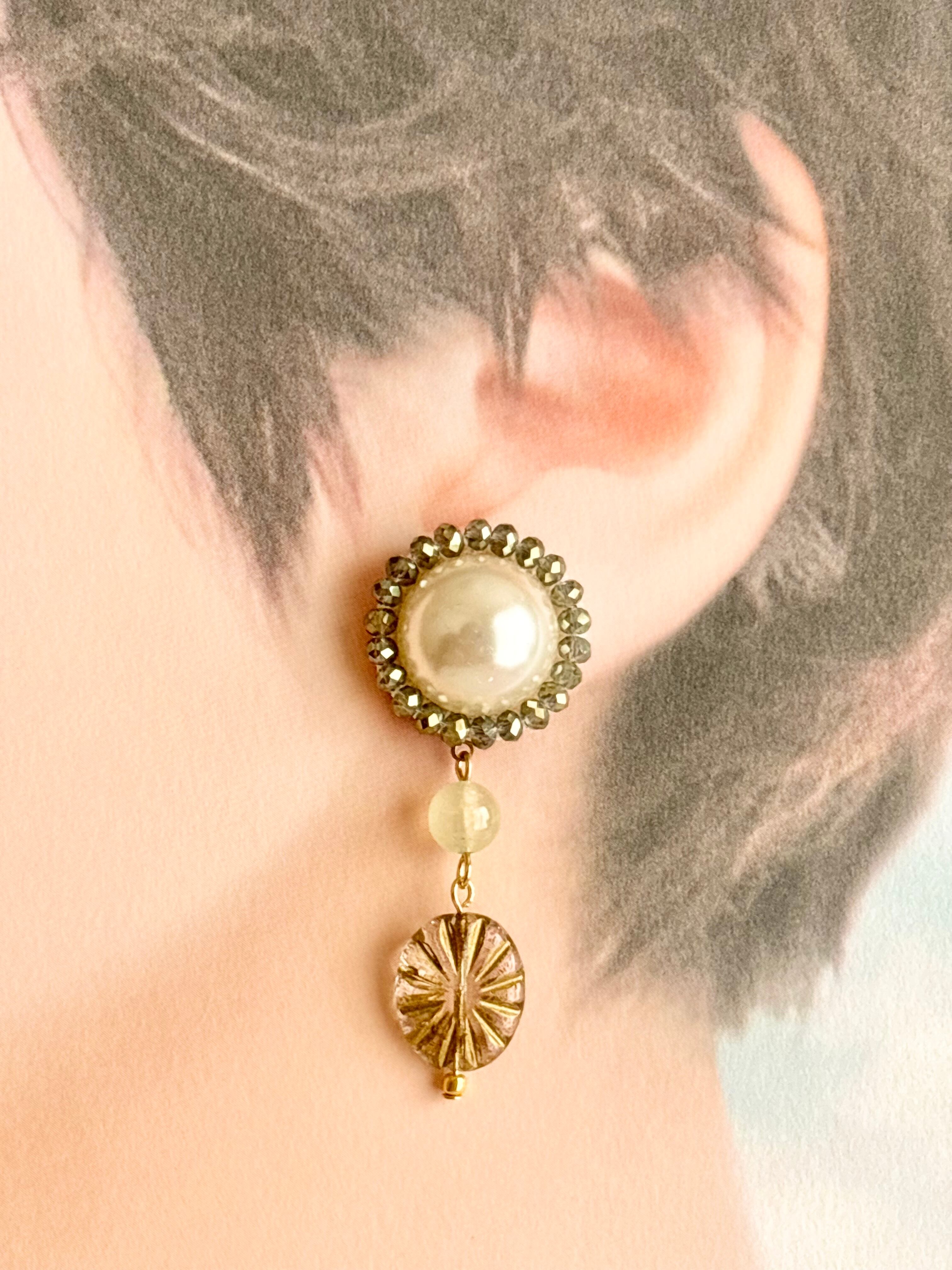 パールのカボションの周りに、ガラスビーズを刺繍した、存在感のあるイヤリングです。