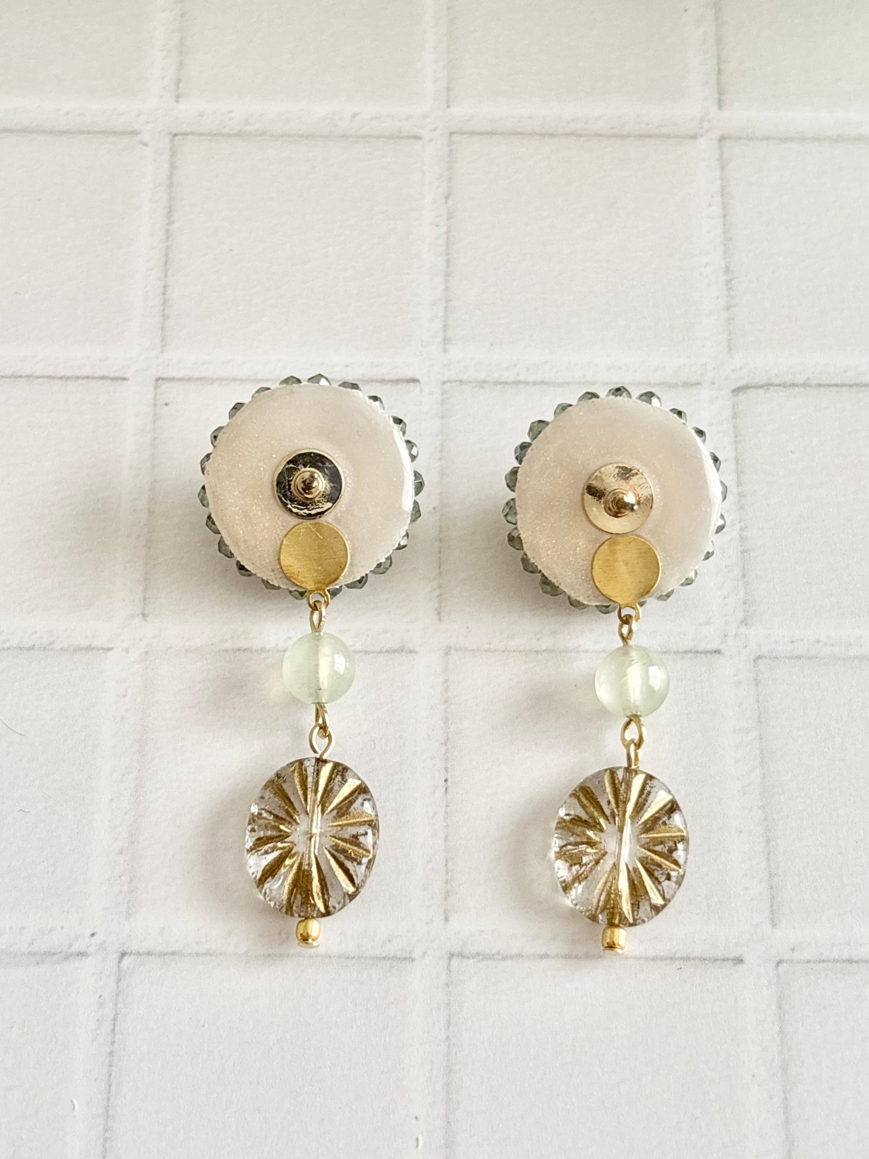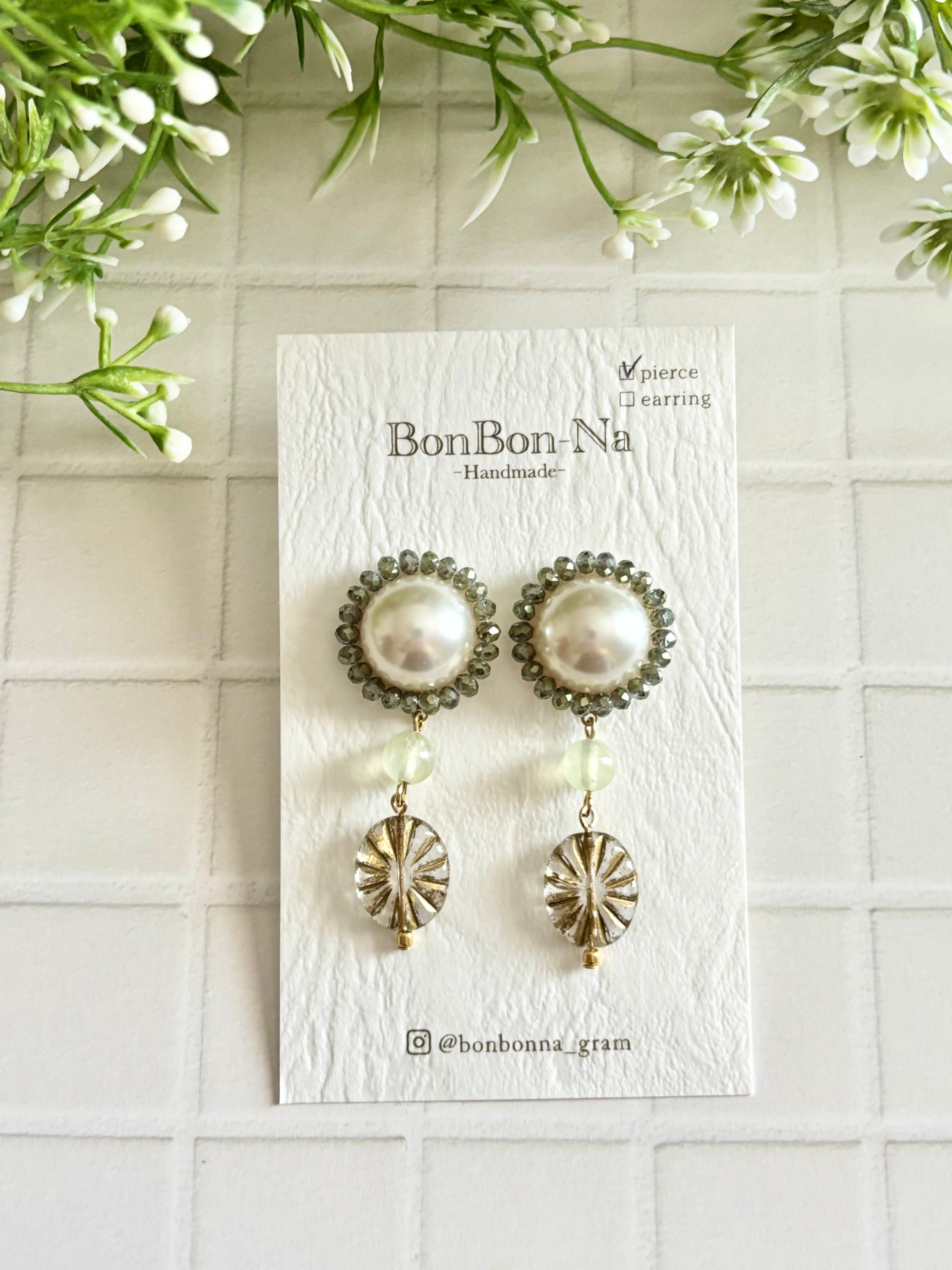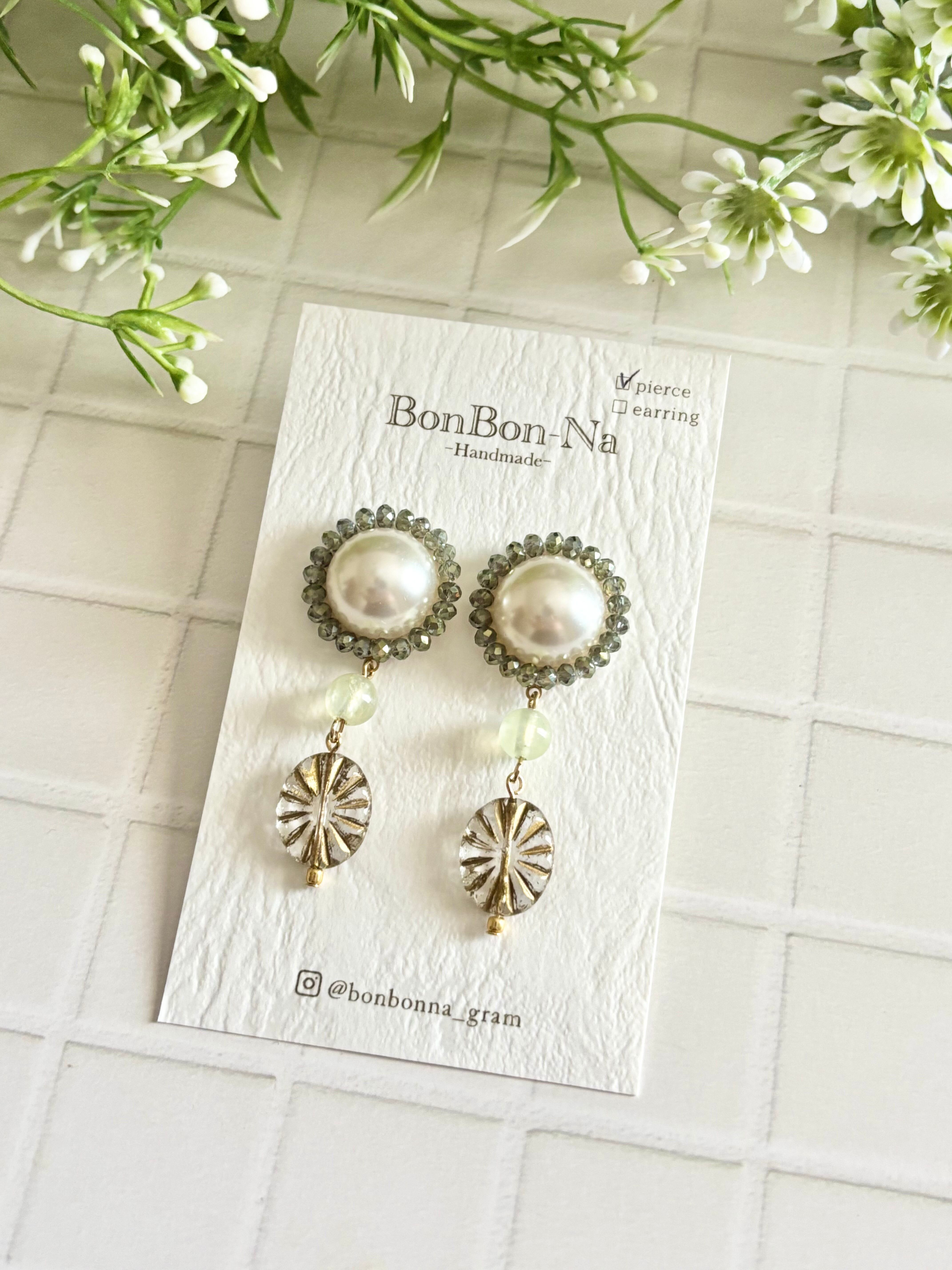 パールのカボションの周りに、ガラスビーズを刺繍した、存在感のあるイヤリングです。