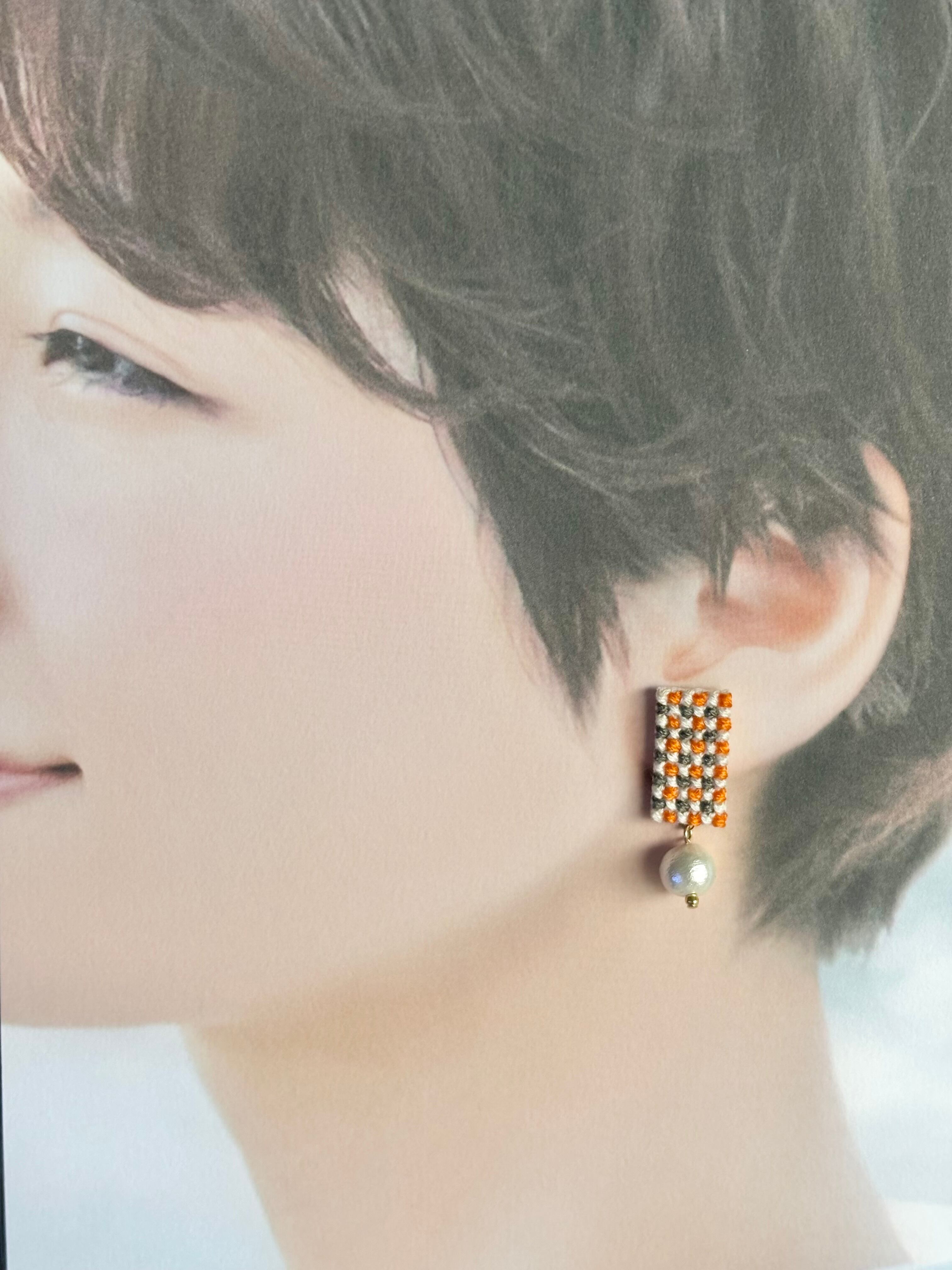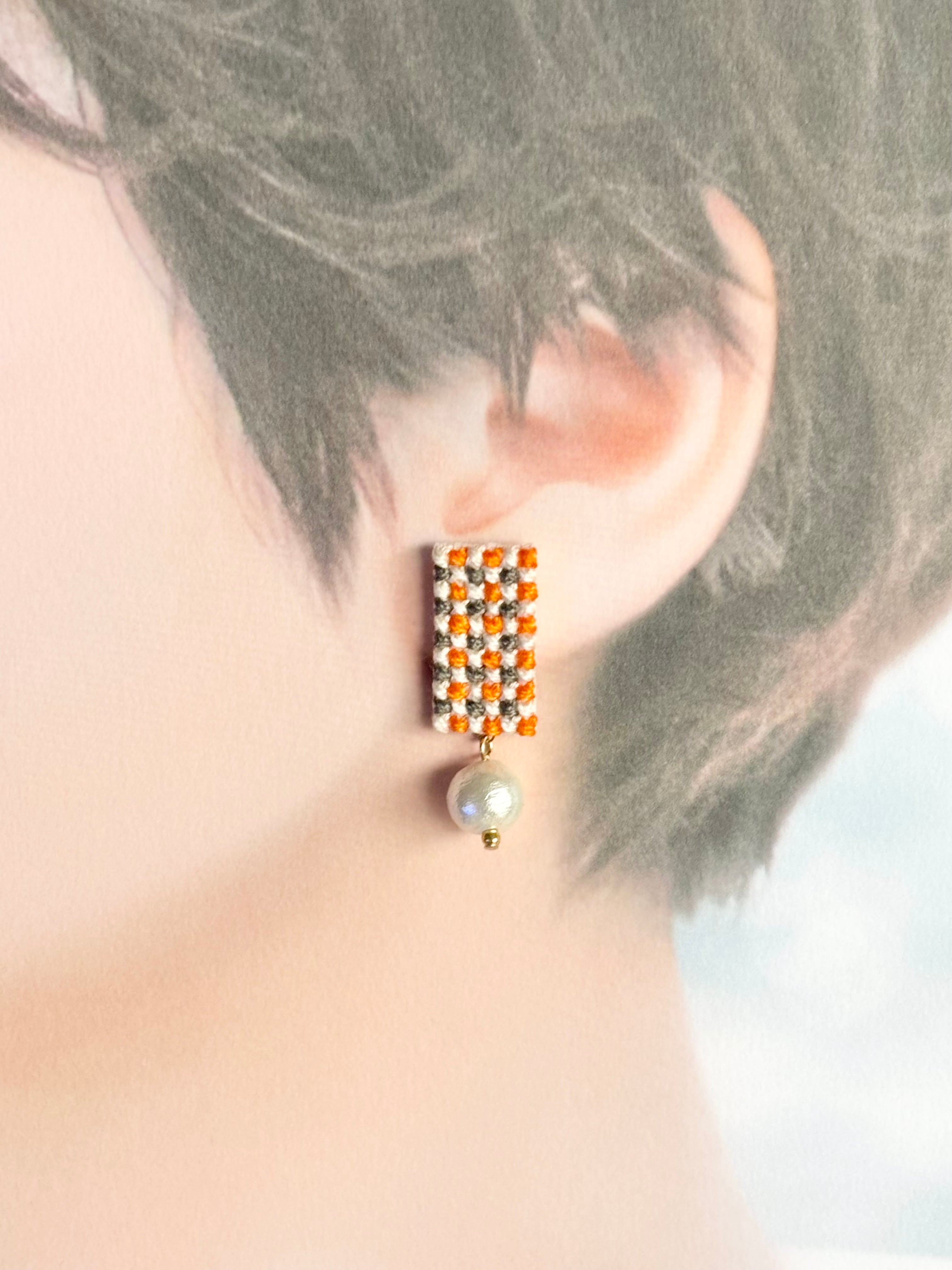 クロスステッチという技法でチェック柄を刺繍して作ったピアスです。