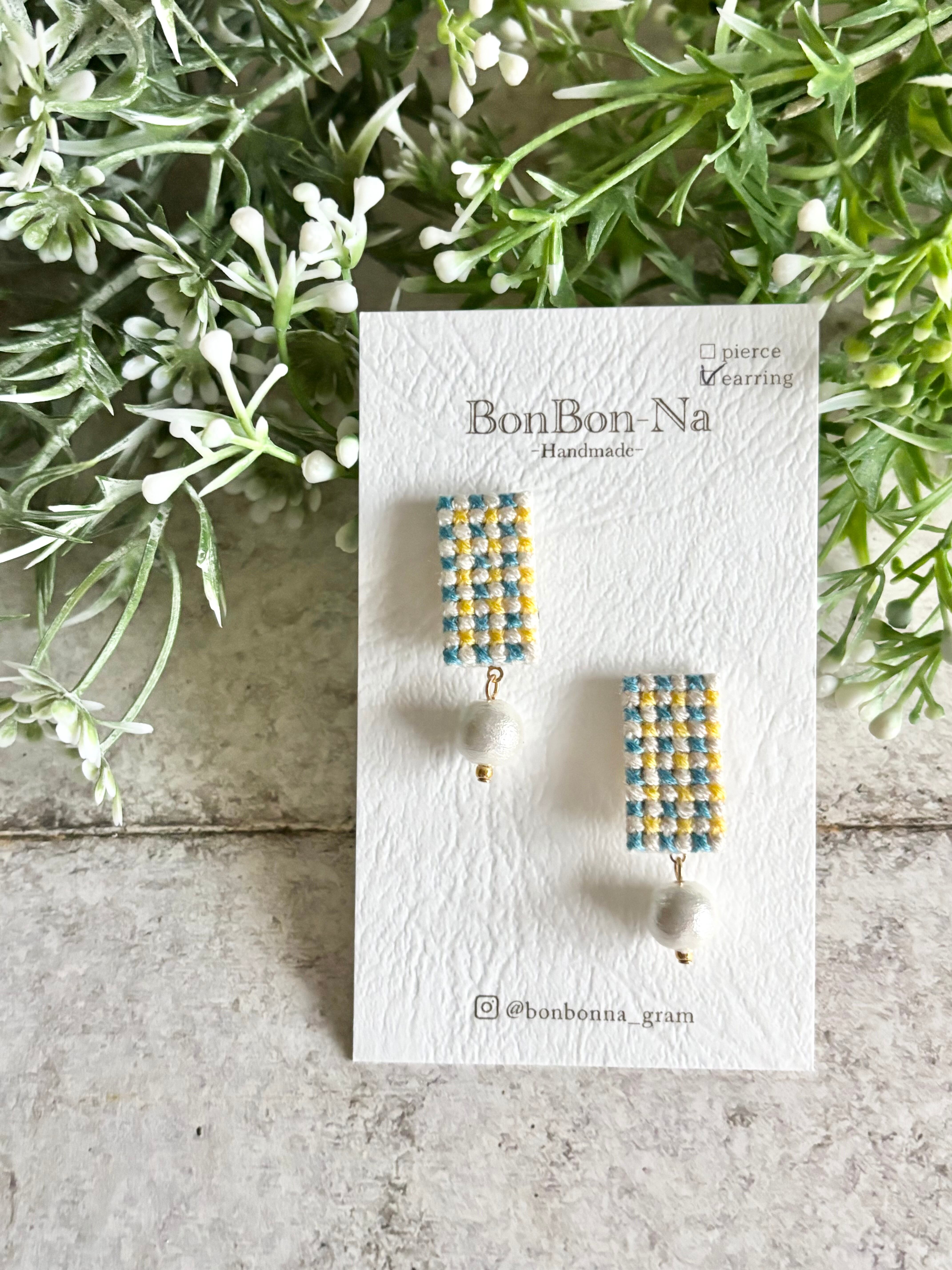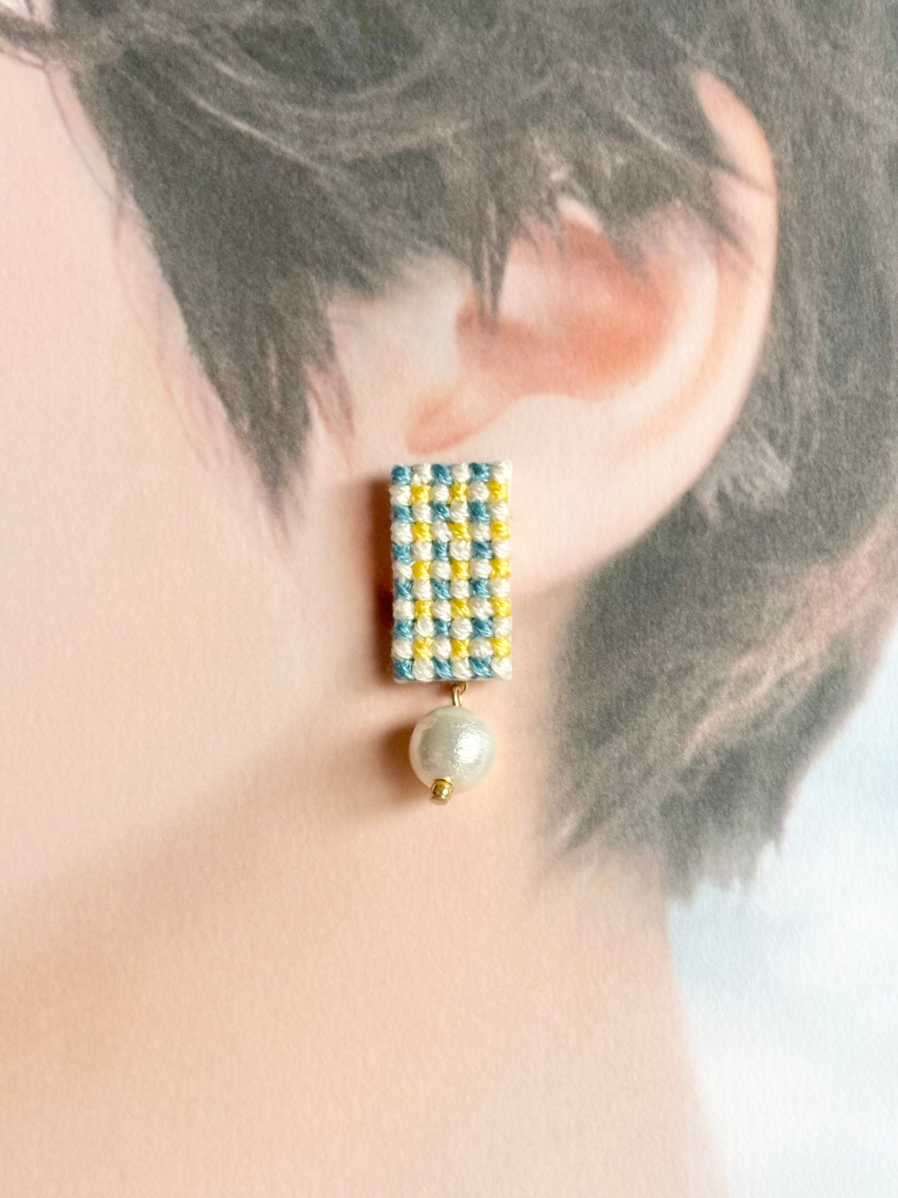 クロスステッチという技法でチェック柄を刺繍して作ったピアスです。