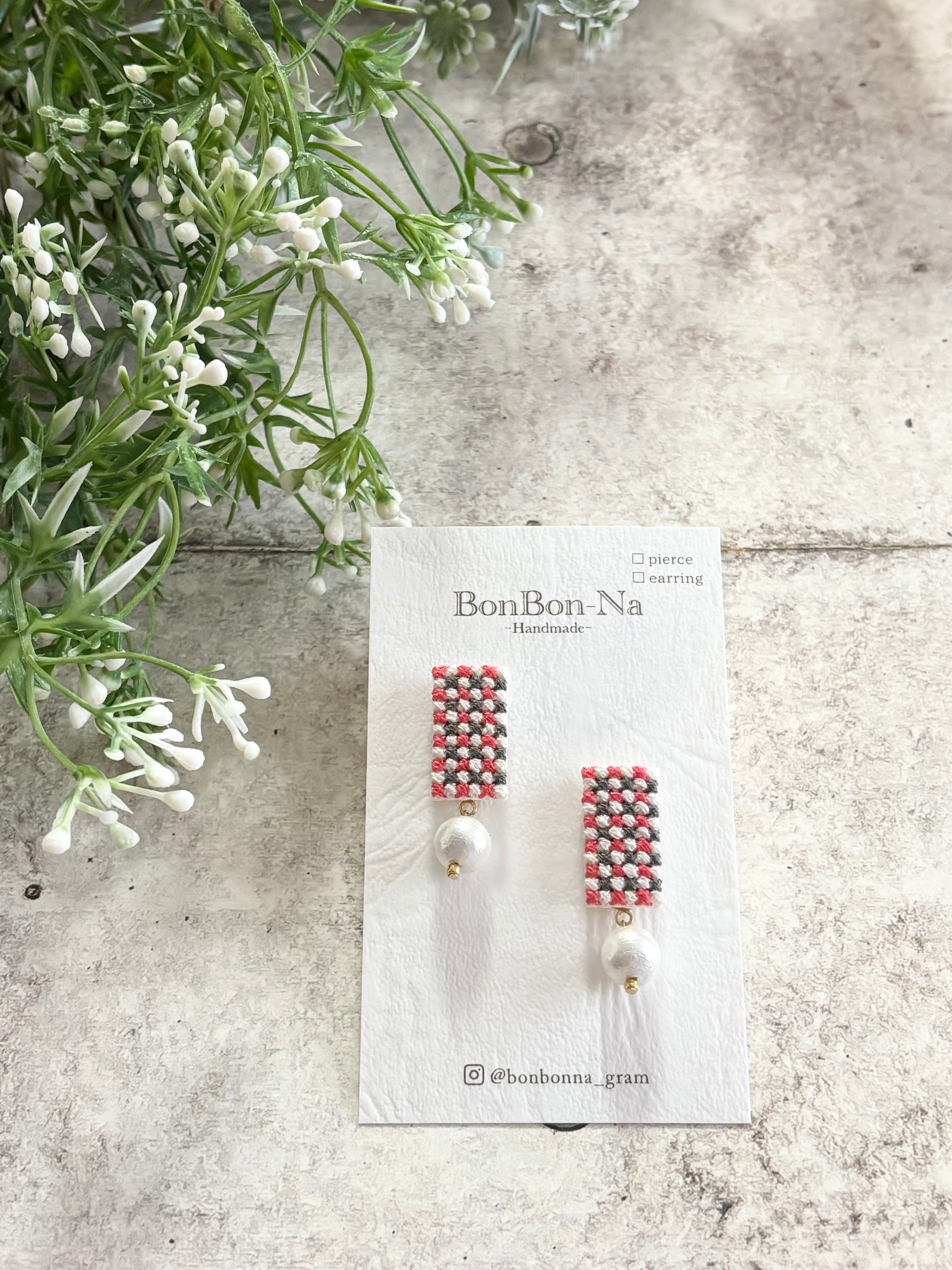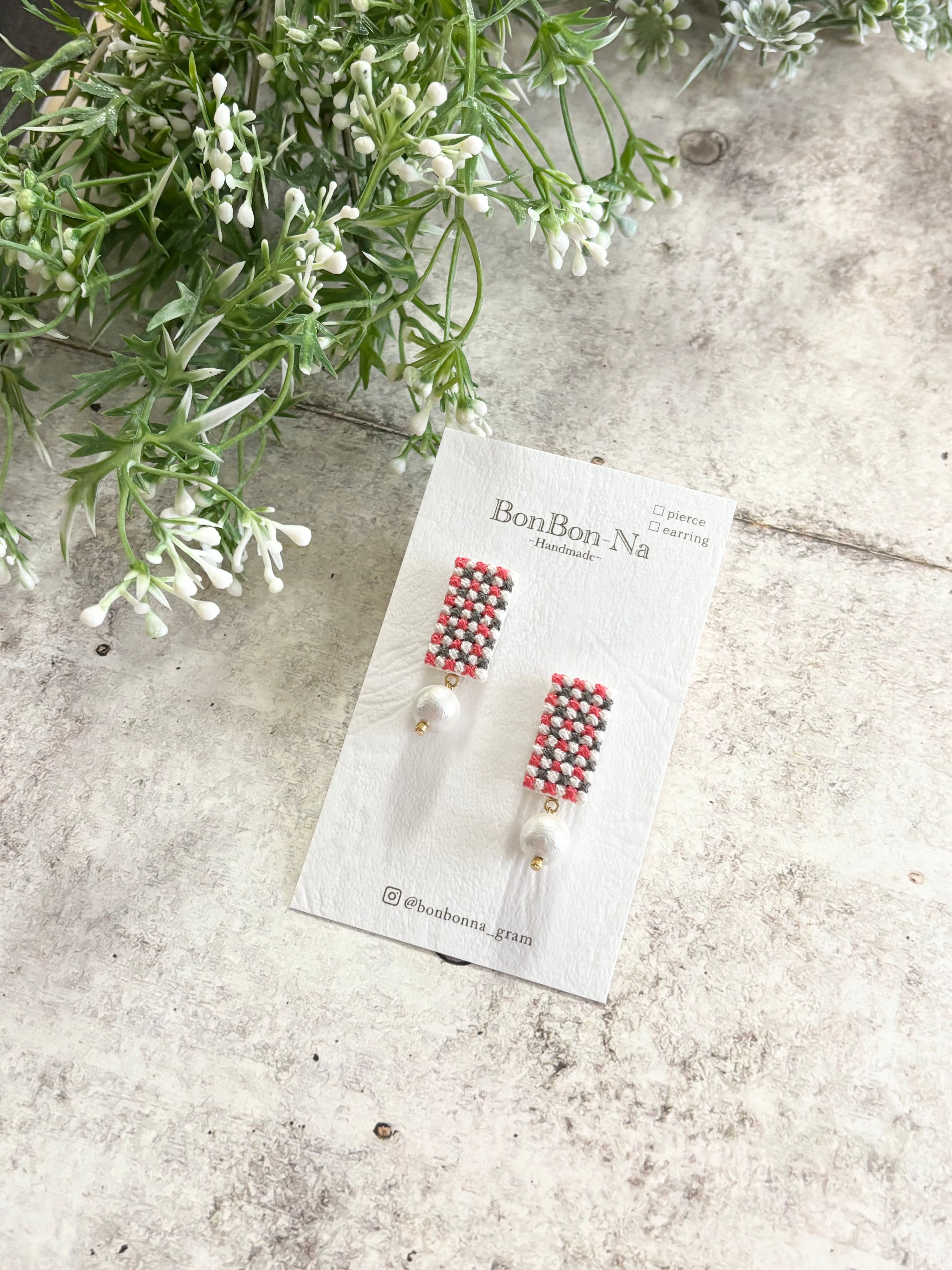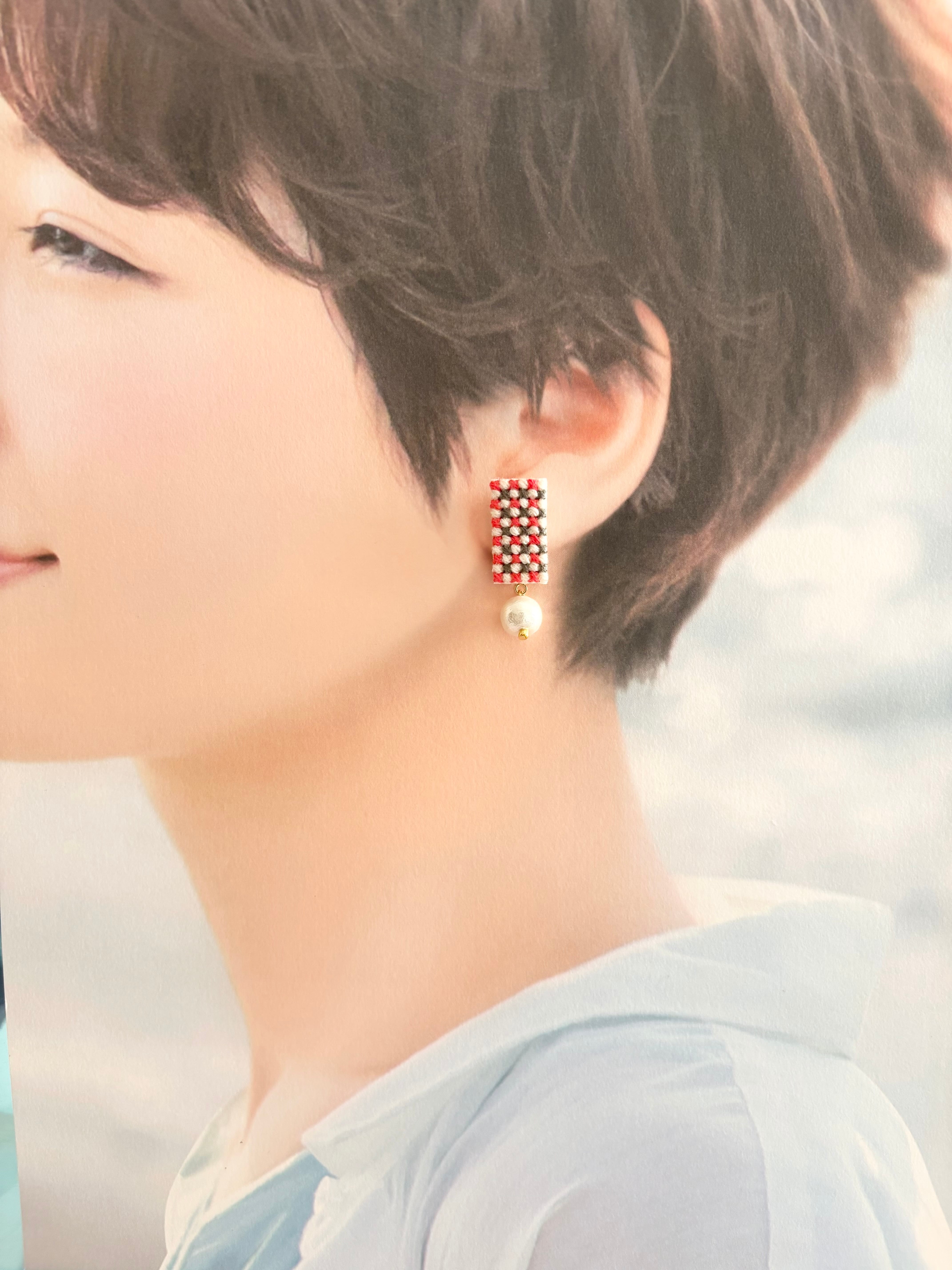 クロスステッチという技法でチェック柄を刺繍して作ったイヤリングです。
