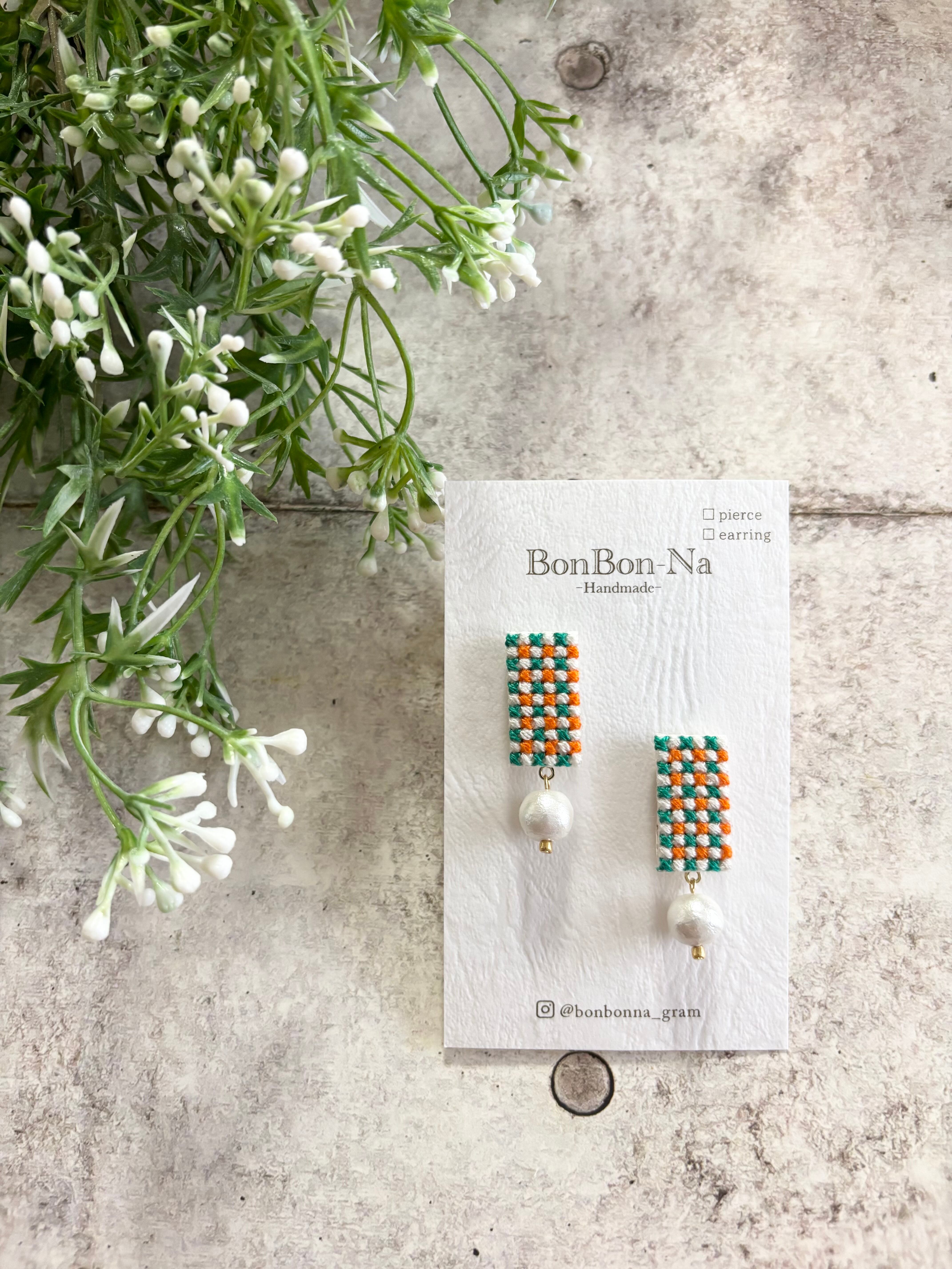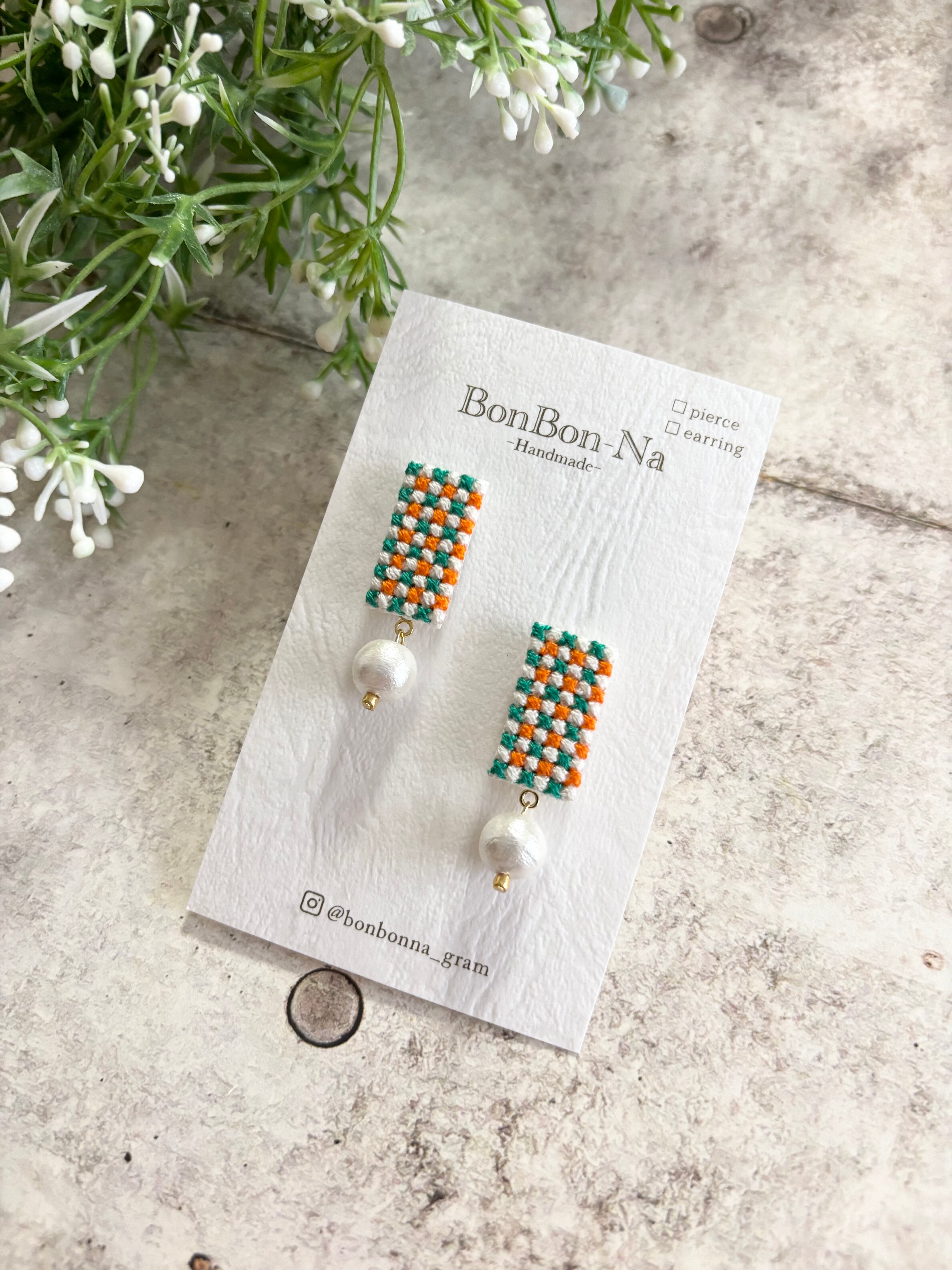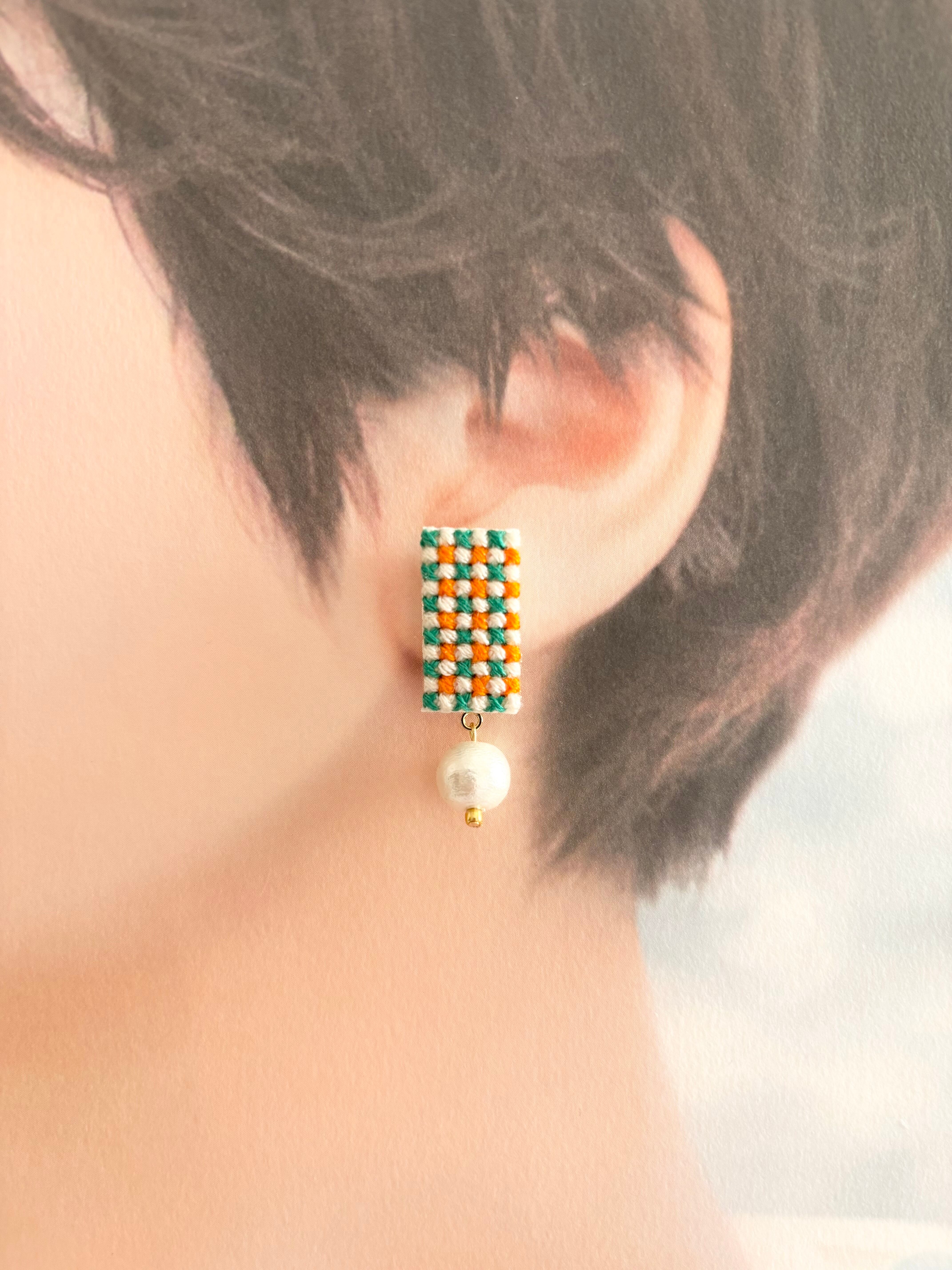 クロスステッチという技法でチェック柄を刺繍して作ったピアスです。